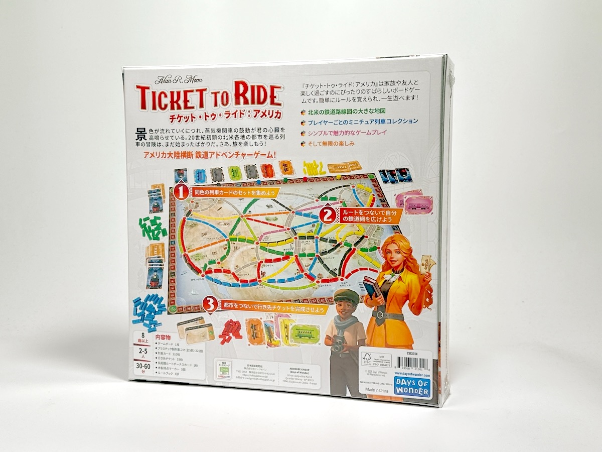 ゲームボード1枚 / 列車コマ240個(青・赤・緑・黄・黒各45個+予備の列車コマ) / カード 144枚 / 列車カード110枚 / サマリーカード1枚 / 行き先チケット30枚 / 長距離ルートボーナスカード1枚 / 追加マップ用プロモーションカード1枚 / Days of Wonderプロモーションカード 1枚 / 木製のスコアマーカー 5個(5色各5個) / 取扱説明書 1冊