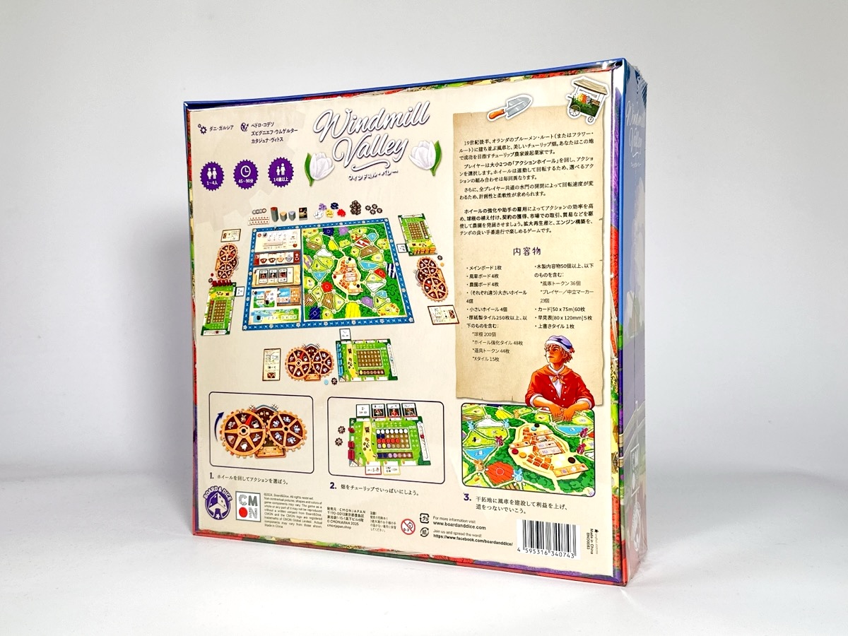 風車の回転や色とりどりのチューリップをゲームに組み込んだテーマ性、プレイ時間を短めにするテンポの良いゲーム進行とエンジンビルドによる拡大再生産が楽しめる作品。ゲームごとに変わるセットアップで異なる展開が楽しめ、ソロプレイもできます。
