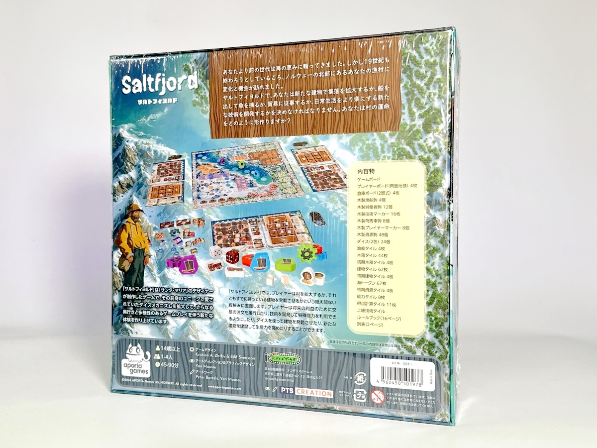 『サルトフィヨルド』は、ノルウェー北部の漁村を舞台に、資源の獲得、新しい建物の建設、漁船の出航、交易、新技術開発を行って勝利点を競うゲームです。