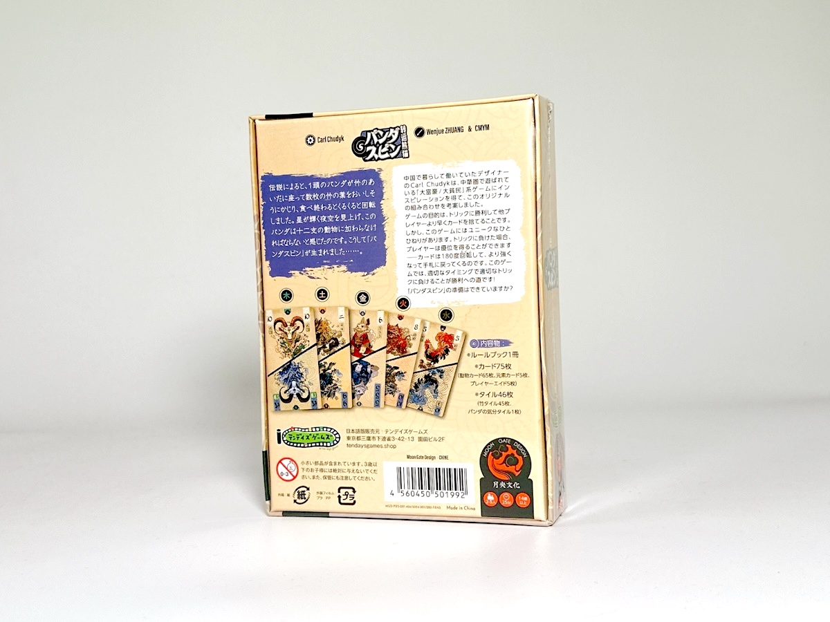 『パンダスピン』は、十二支と五行をイメージした色と数のカードを、前に出されたカードより強さが上回るように出していき、いち早く手札を出し切ることを目指すゲームです。
