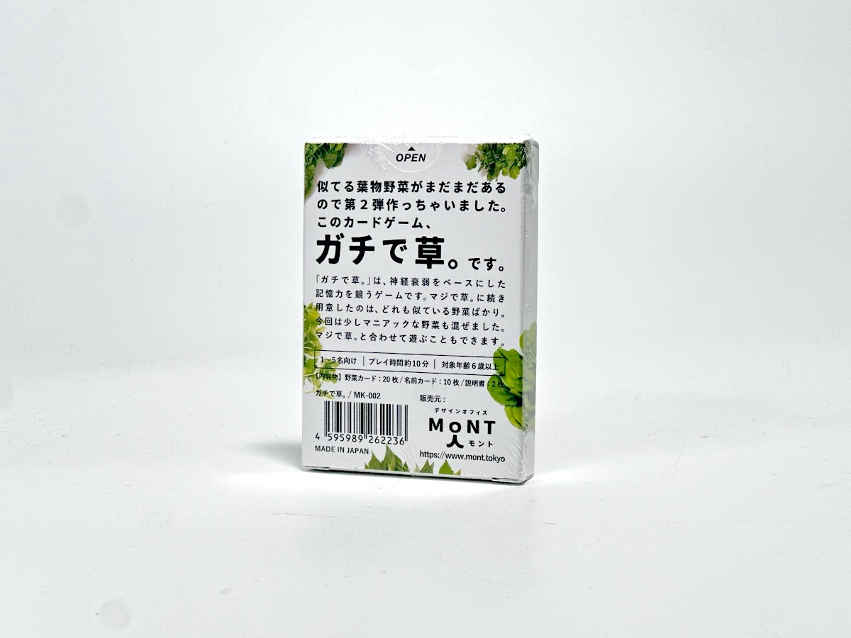 今回は、野菜ガチ勢に対抗するべく、マニアックな野菜を多めに混ぜました。「ガチで草。」単体でも遊べますが、第1弾の「マジで草。」と混ぜて、合計20種類の野菜で遊ぶこともできます。