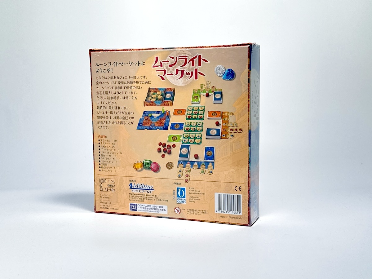 宝石タイル 150個 / 金貨カード 65枚 / 封蝋チップ 29個 / プレーヤーボード 5枚 / ベルベッドクッション 5個 / 得点マーカー 5個 / 30/60マーカー 5個 / スタートコイン 5個 / 宝石箱 1個 / 得点トラック 1個 / ルールブック