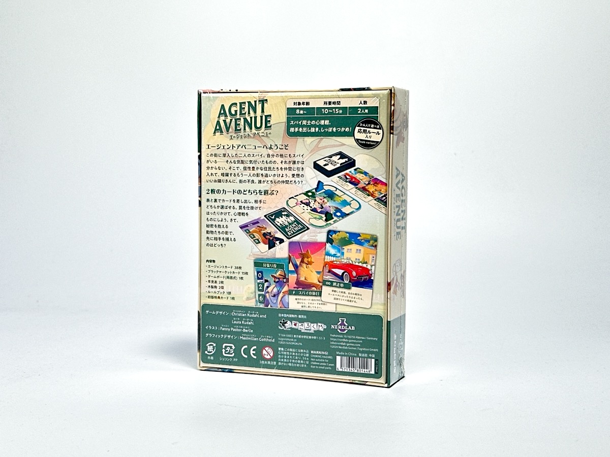 『エージェントアベニュー』は、郊外の住宅街に住む引退スパイが追いかけっこを繰り広げる2人用の読み合い&セットコレクションゲームです。
