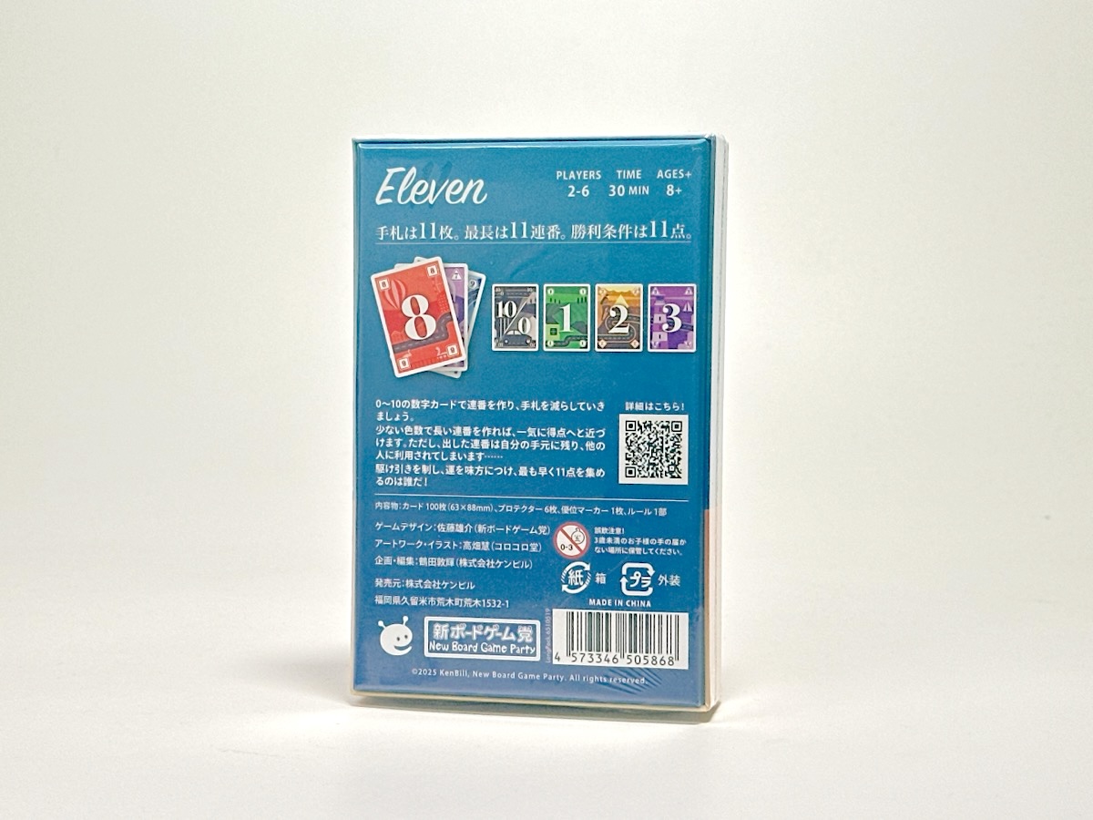 『イレブン(Eleven)』は、初期手札11枚、最長連番は11連番、勝利条件は11点という11で揃えたゴーアウトゲームです。