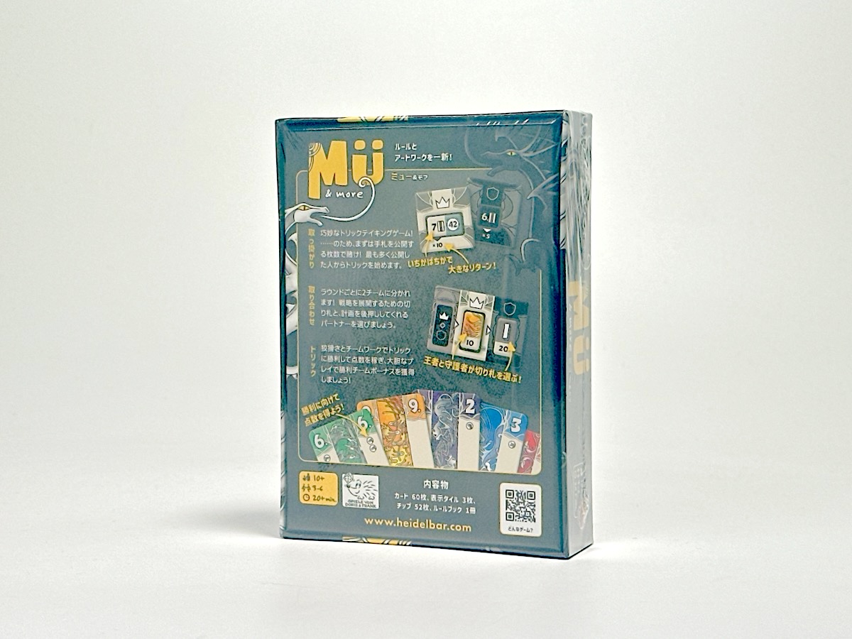 「ミュー」は、ラウンドの開始時にオークションが行われるチーム戦トリックテイキング。オークションでは勝つために必要な得点を手札を公開して競り、チーム分け(1位チームと2位チーム)と切り札が決められます。マストフォローで色と数字の切り札があるトリックテイキングを行い、獲得したカードの得点のほか、勝ったチームにボーナスがあります。3~4ラウンド行って個人得点の合計を競います。