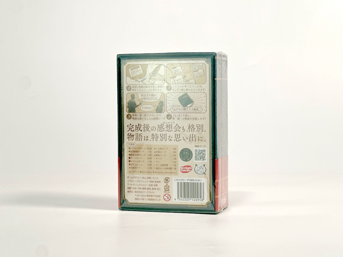 エピローグカード 30枚 / 時間経過カード 1枚 / 最後の場所カード 6枚 / ページカード 18枚 / タイトルボード 1枚 / 決定フレーム 10枚 / 名前カード 12枚 / 一人称カード 4枚 / 年齢カード 2枚 / 職業カード 8枚 / ダイス 3個 / ペン 6本 / ルール説明書 1枚 / 補足ルール説明書 1枚